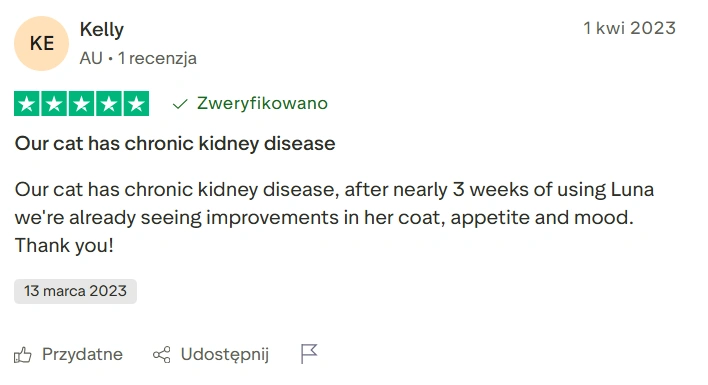 Our cat has chronic kidney disease, after nearly 3 weeks of using Luna we’re already seeing improvements in her coat, appetite and mood. Thank you!